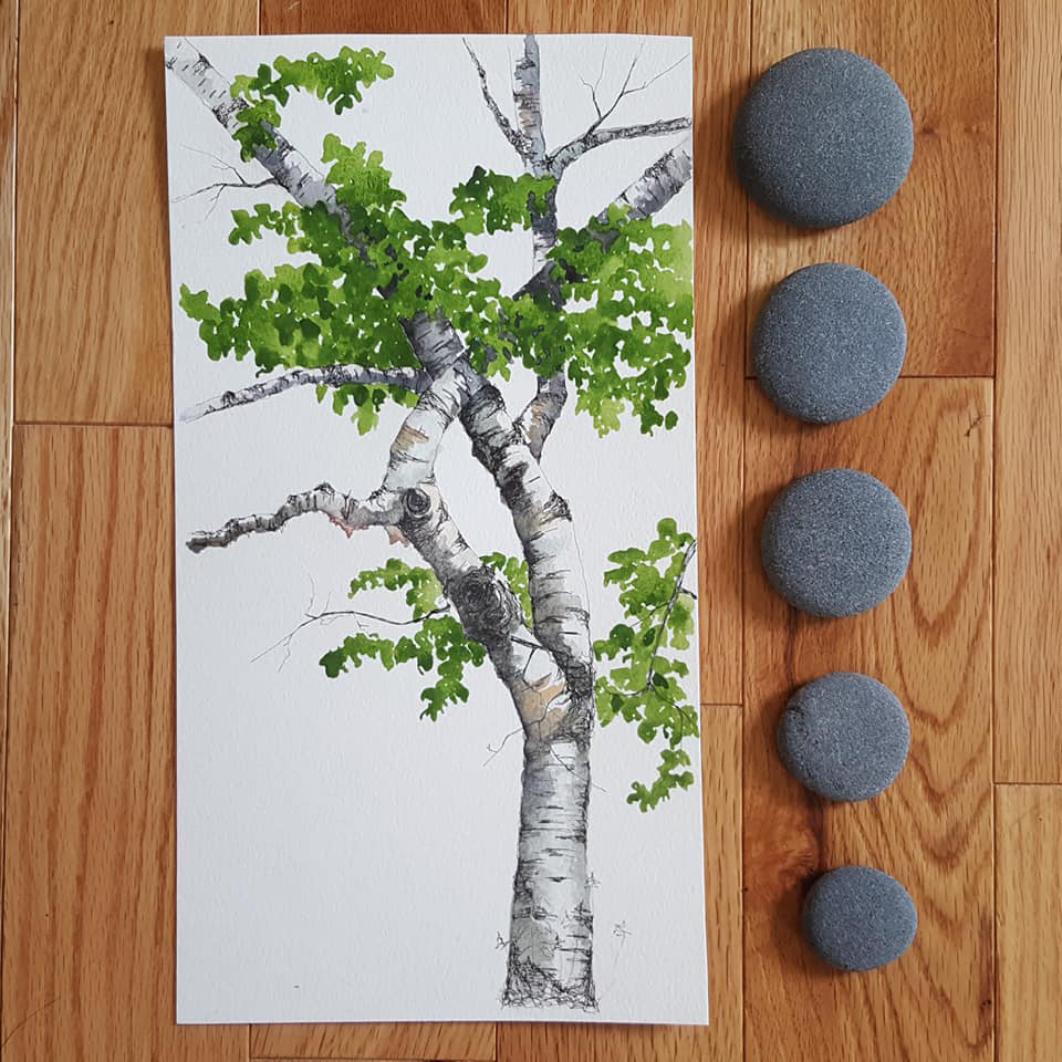 Intertwined is a portrait of a tree found in Kennebunkport, Maine on a recent trip. I loved adding the little leaves to the tangled branches. This is my favorite piece to date. I keep painting the same tree, becoming more inspired every time I start a new piece. I love and hate when this happens. I know I should be working on other, different paintings, but just can’t seem to get the tree out of my head. So I will keep painting it in different sizes until I am satisfied and can leave it be for a little while.